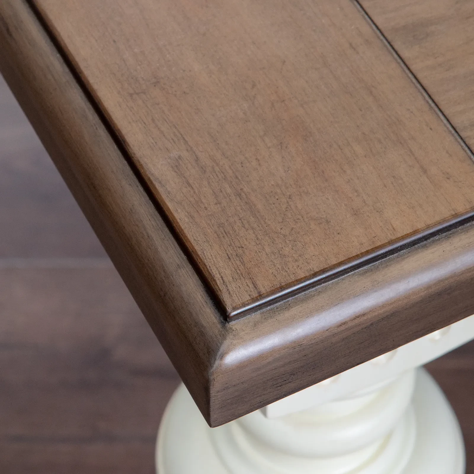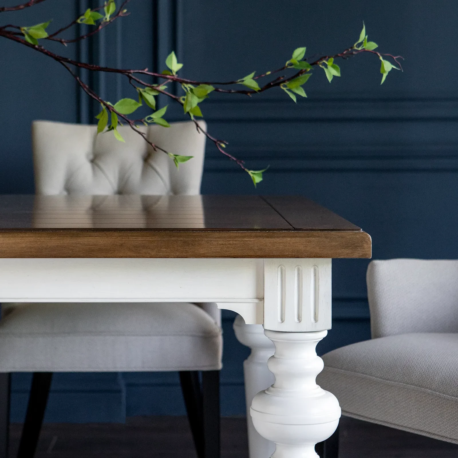 Большой раздвижной стол, выполненный из шпона клёна. Длина столешницы регулируется за счет двух вставок, каждая шириной 510 мм. С одной вставкой длина столешницы 2440 мм, с двумя - 2950 мм. Опоры и подстолье цвета слоновой кости, столешница - теплый коричневый.