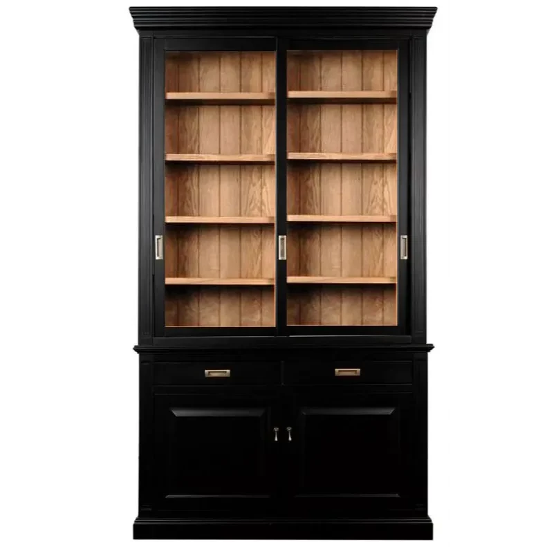 Двухсекционная витрина с откатными дверцами выполнена из массива березы (гладкая фактура) или шпона ясеня (с фактурой дерева), комбинированный выкрас в эмали черного или белого цвета.