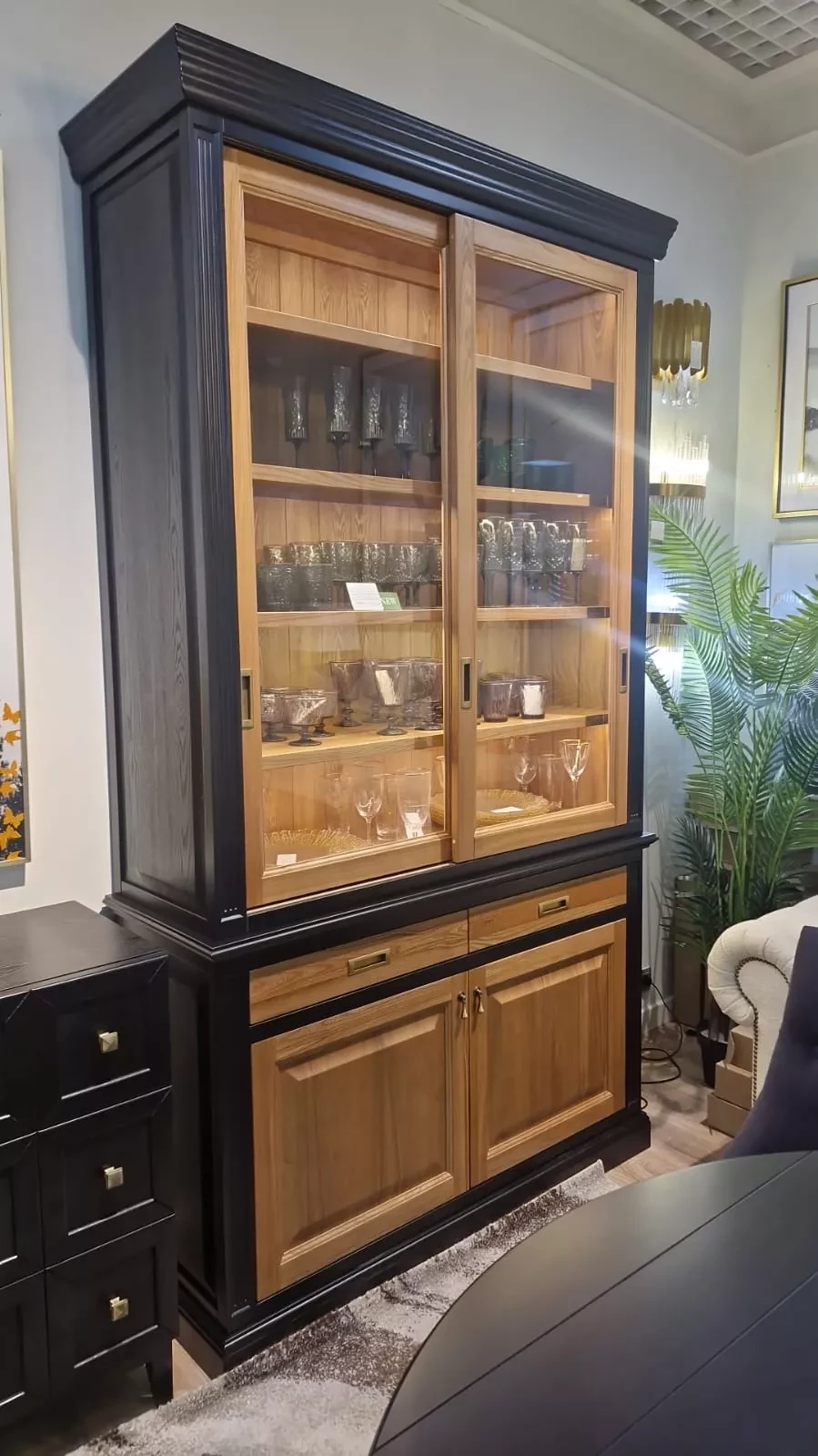 Двухсекционная витрина с откатными дверцами выполнена из массива березы (гладкая фактура) или шпона ясеня (с фактурой дерева), комбинированный выкрас в эмали черного или белого цвета.